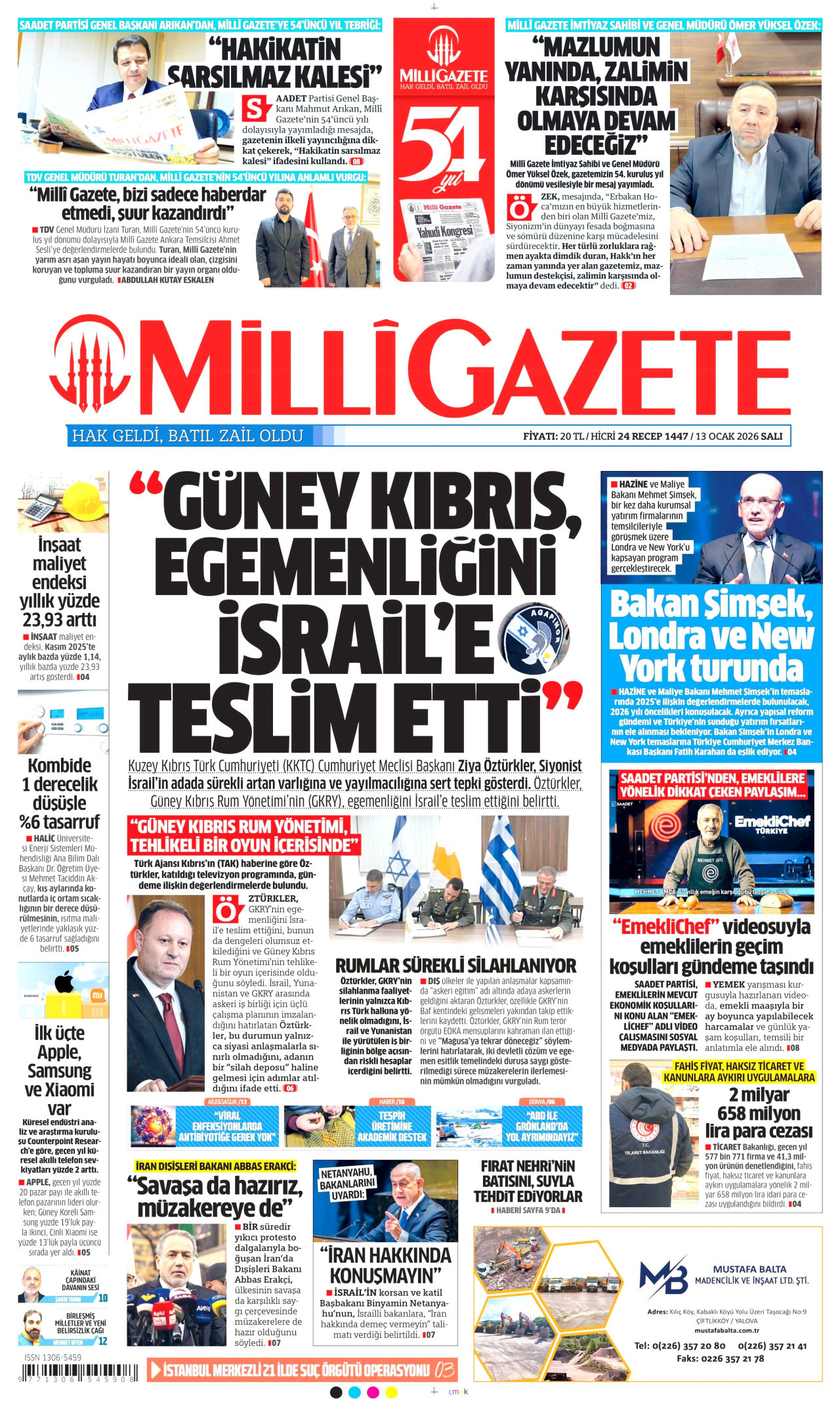 MİLLİ GAZETE Gazetesi 13 Ocak 2026, Salı Günü Manşeti