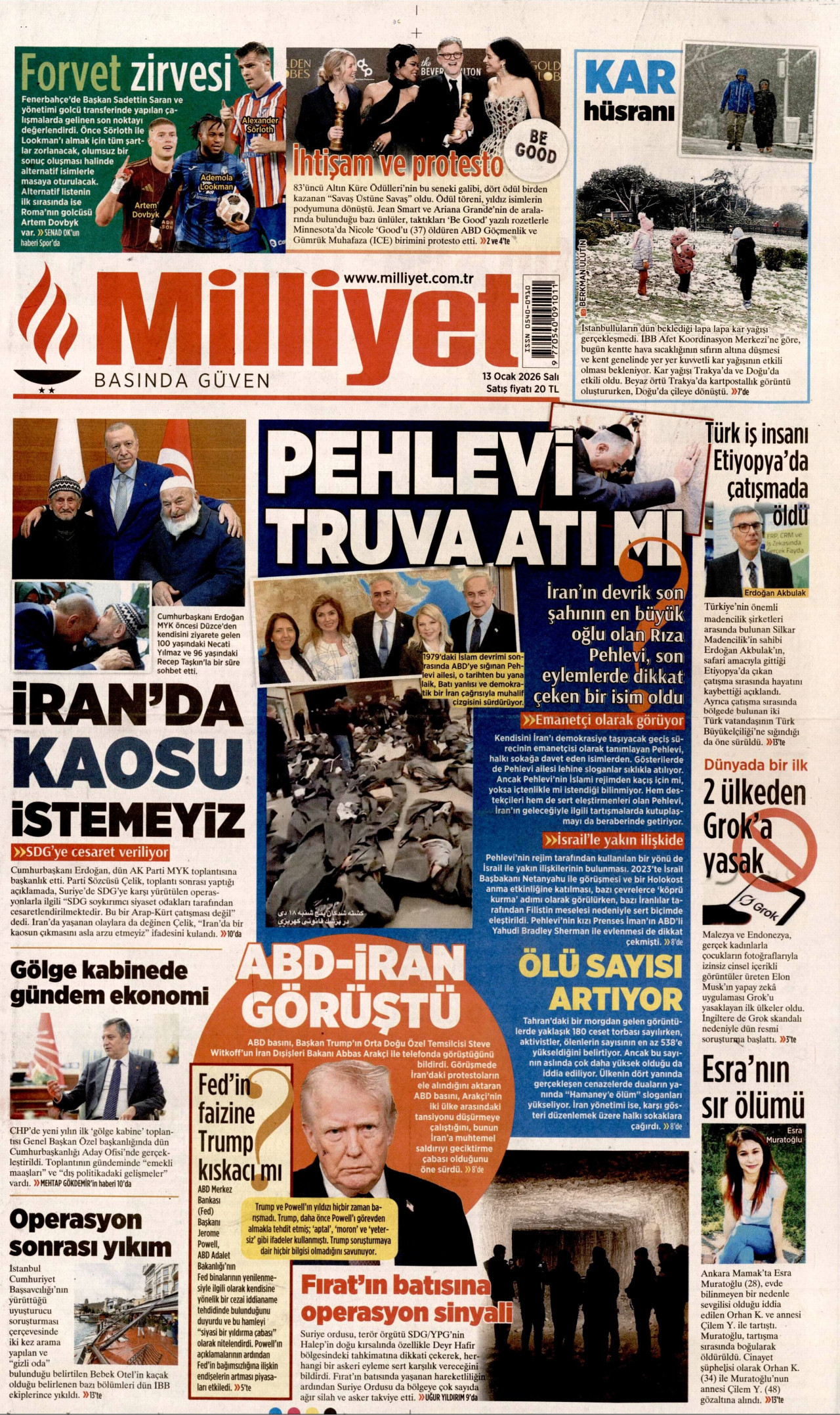 MİLLİYET Gazetesi 13 Ocak 2026, Salı Günü Manşeti