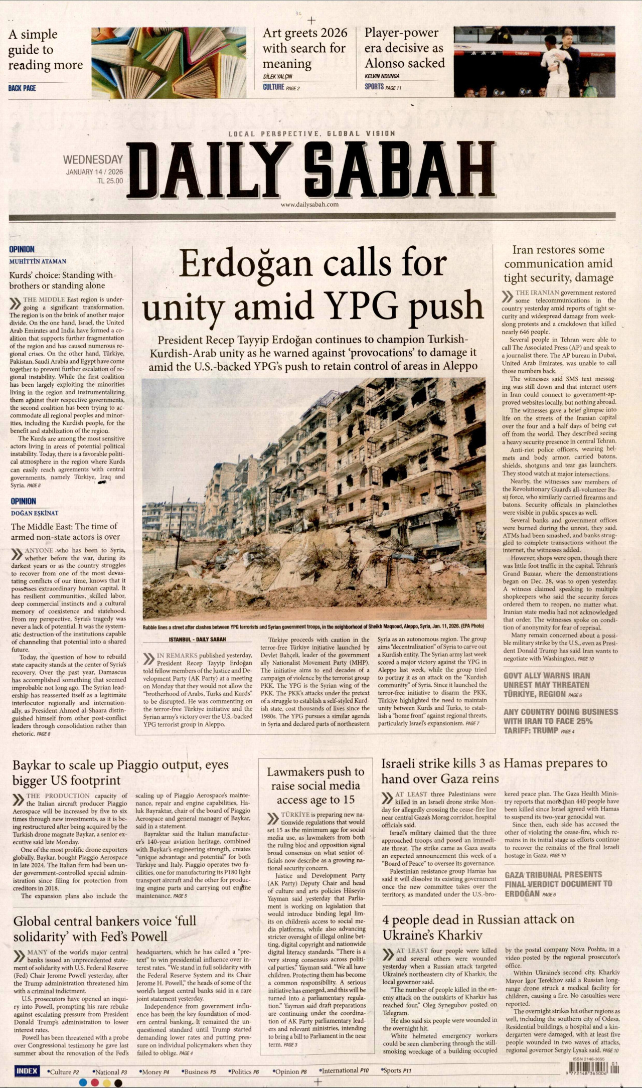 DAİLY SABAH Gazetesi 14 Ocak 2026, Çarşamba Günü Manşeti