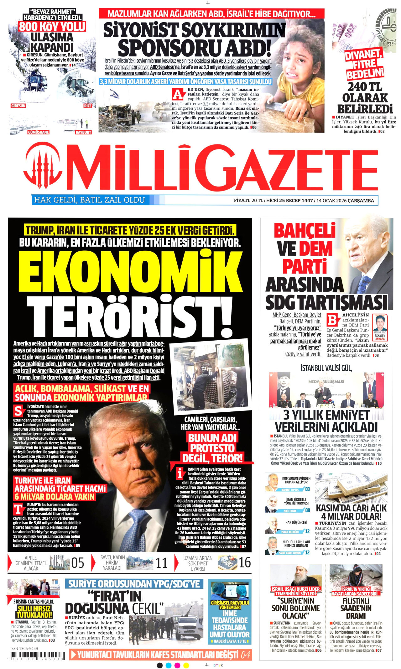 MİLLİ GAZETE Gazetesi 14 Ocak 2026, Çarşamba Günü Manşeti