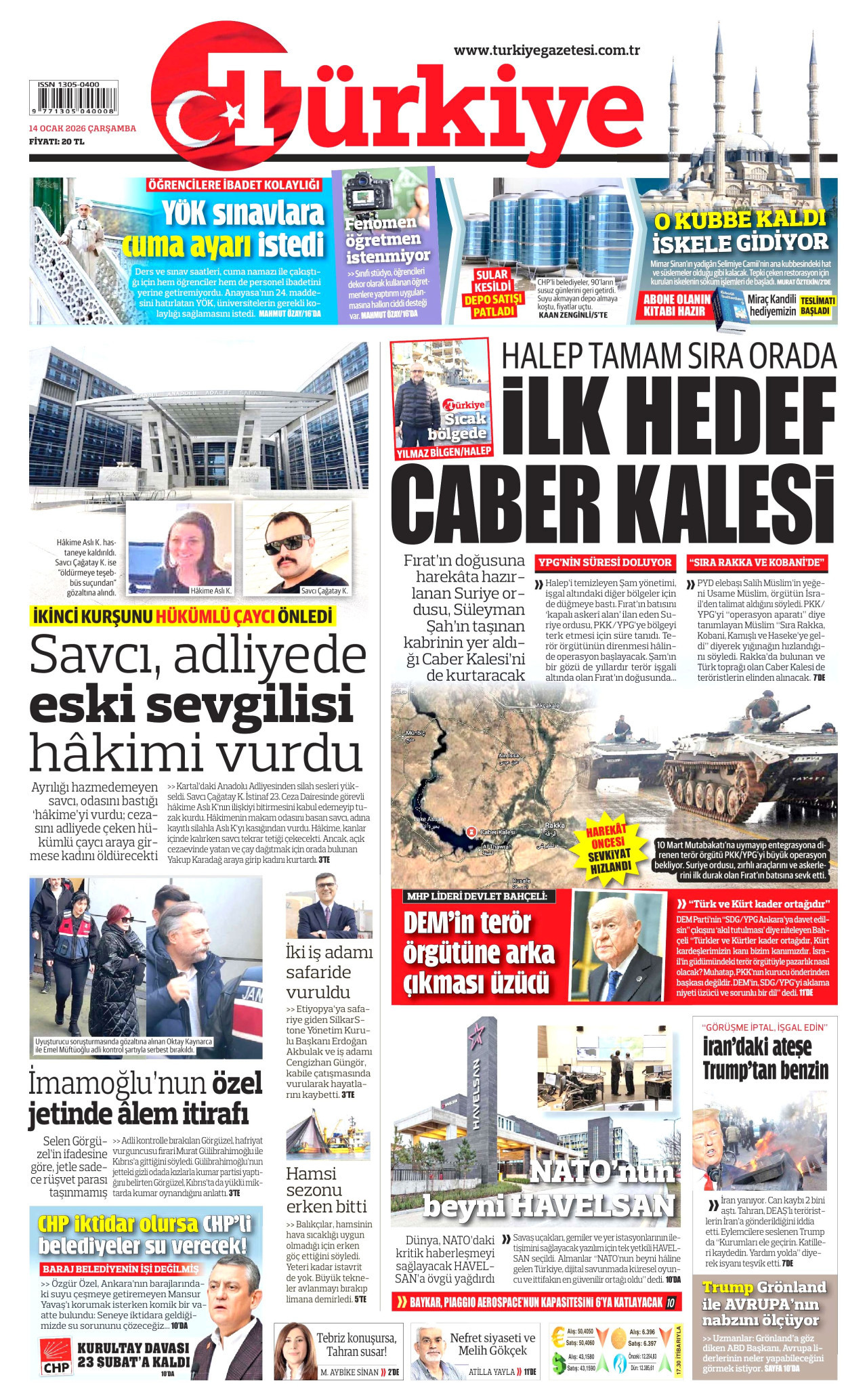 TÜRKİYE GAZETESİ Gazetesi 14 Ocak 2026, Çarşamba Günü Manşeti