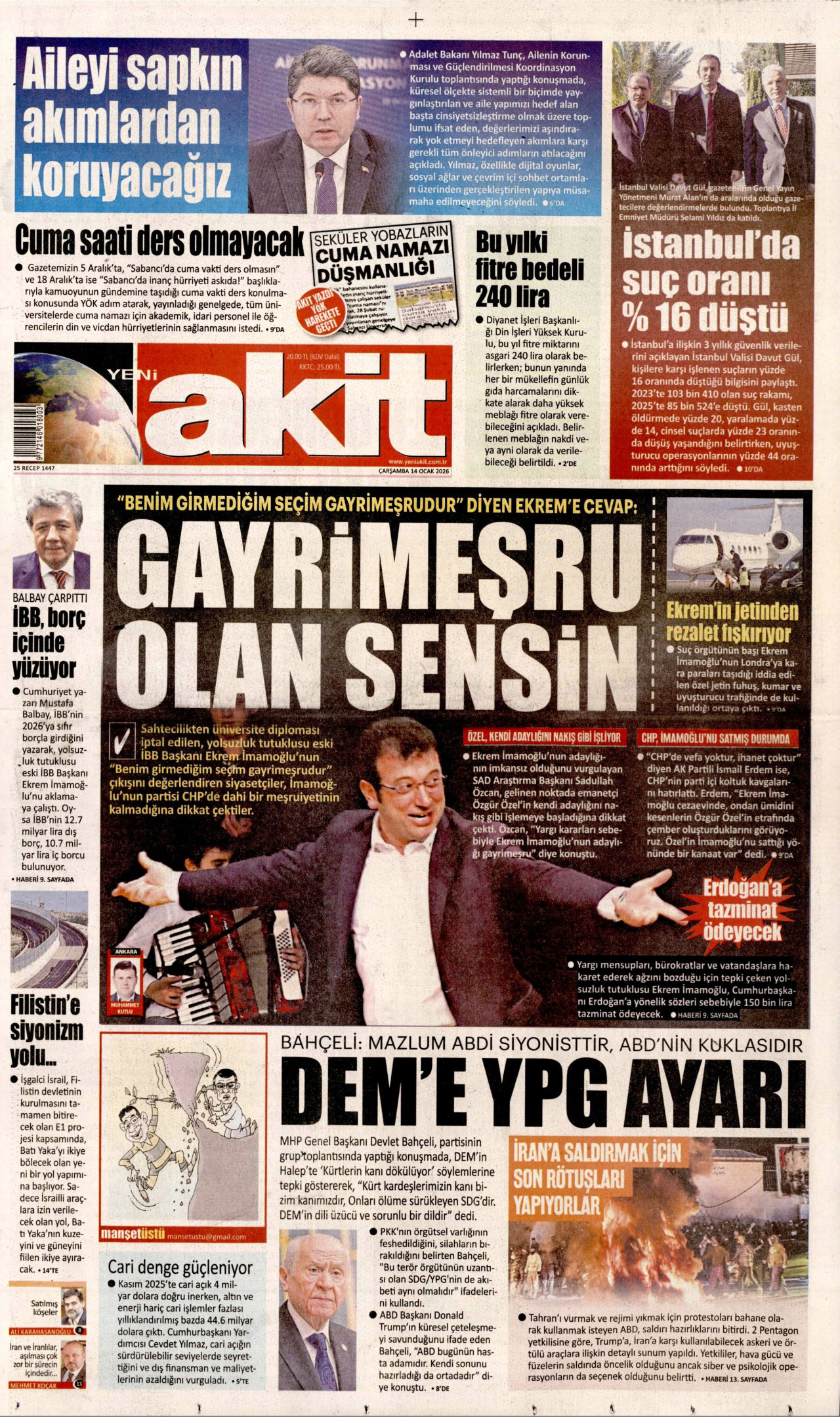 YENİ AKİT Gazetesi 14 Ocak 2026, Çarşamba Günü Manşeti