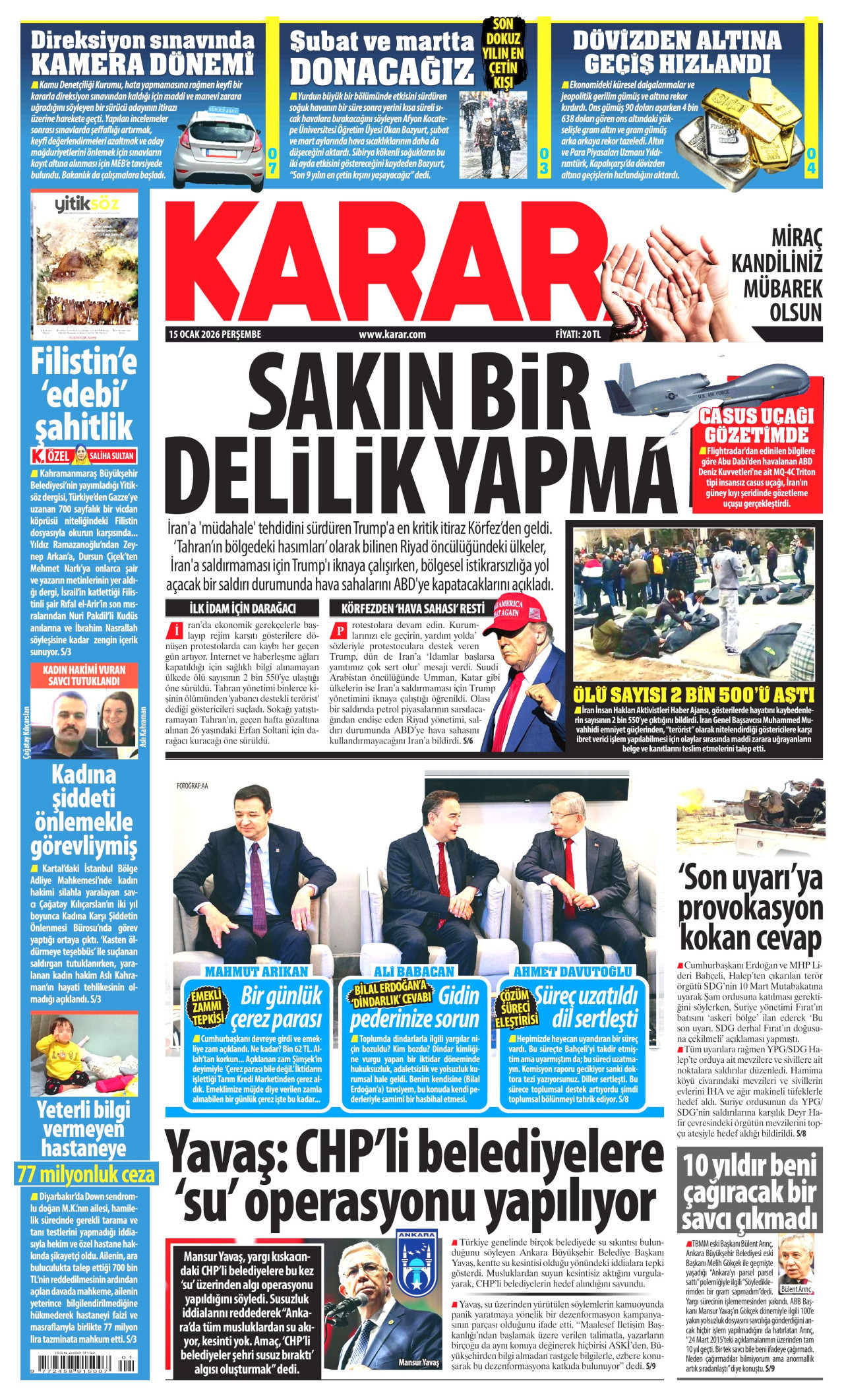 KARAR Gazetesi 15 Ocak 2026, Perşembe Günü Manşeti
