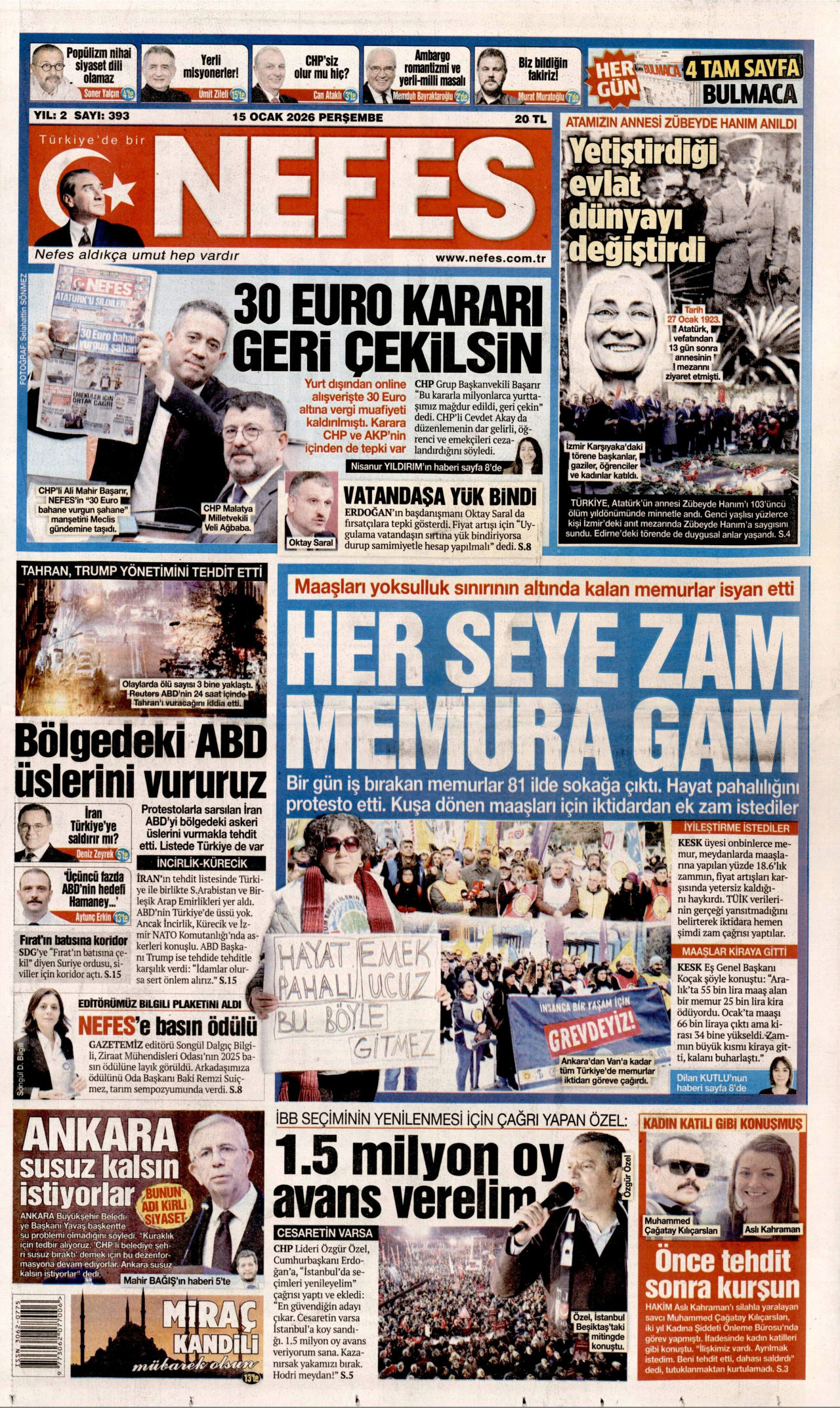 NEFES Gazetesi 15 Ocak 2026, Perşembe Günü Manşeti
