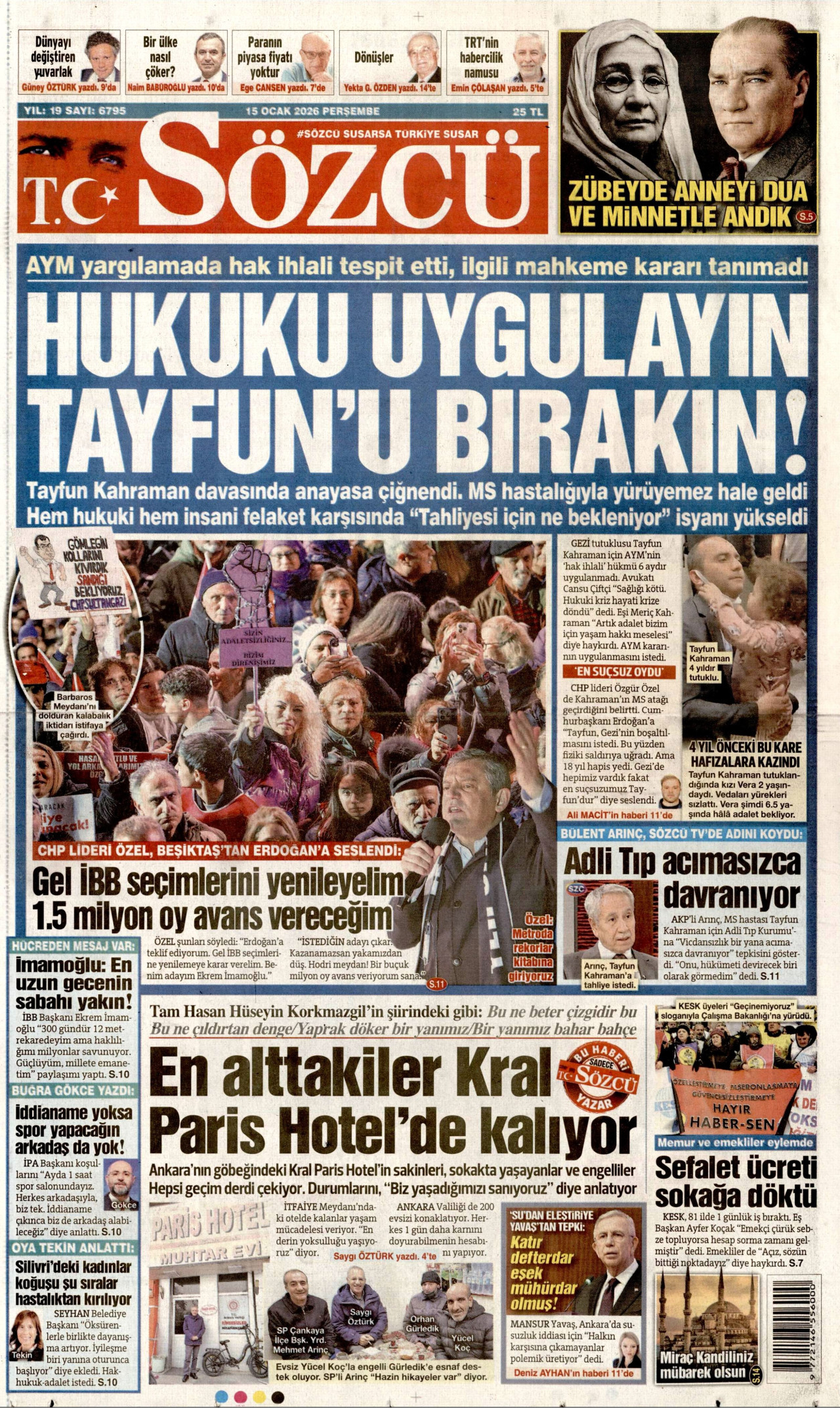 SÖZCÜ Gazetesi 15 Ocak 2026, Perşembe Günü Manşeti