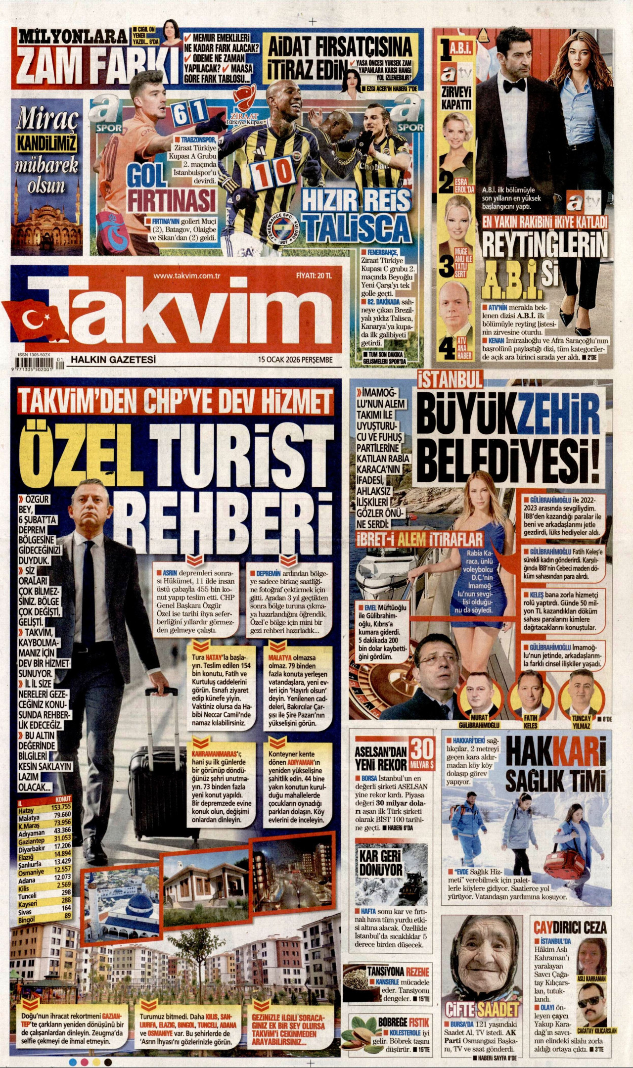 TAKVİM Gazetesi 15 Ocak 2026, Perşembe Günü Manşeti
