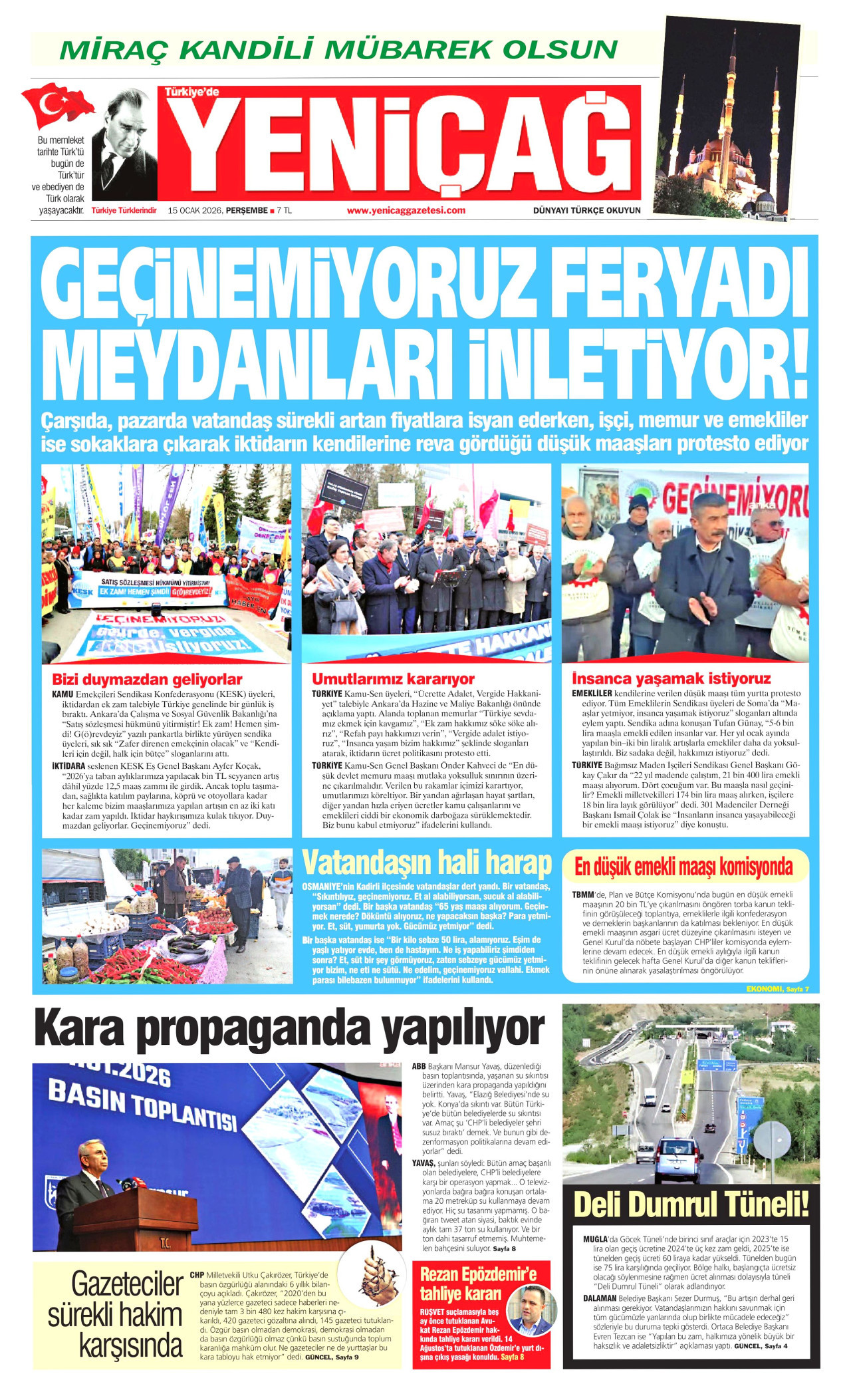 YENİÇAĞ Gazetesi 15 Ocak 2026, Perşembe Günü Manşeti