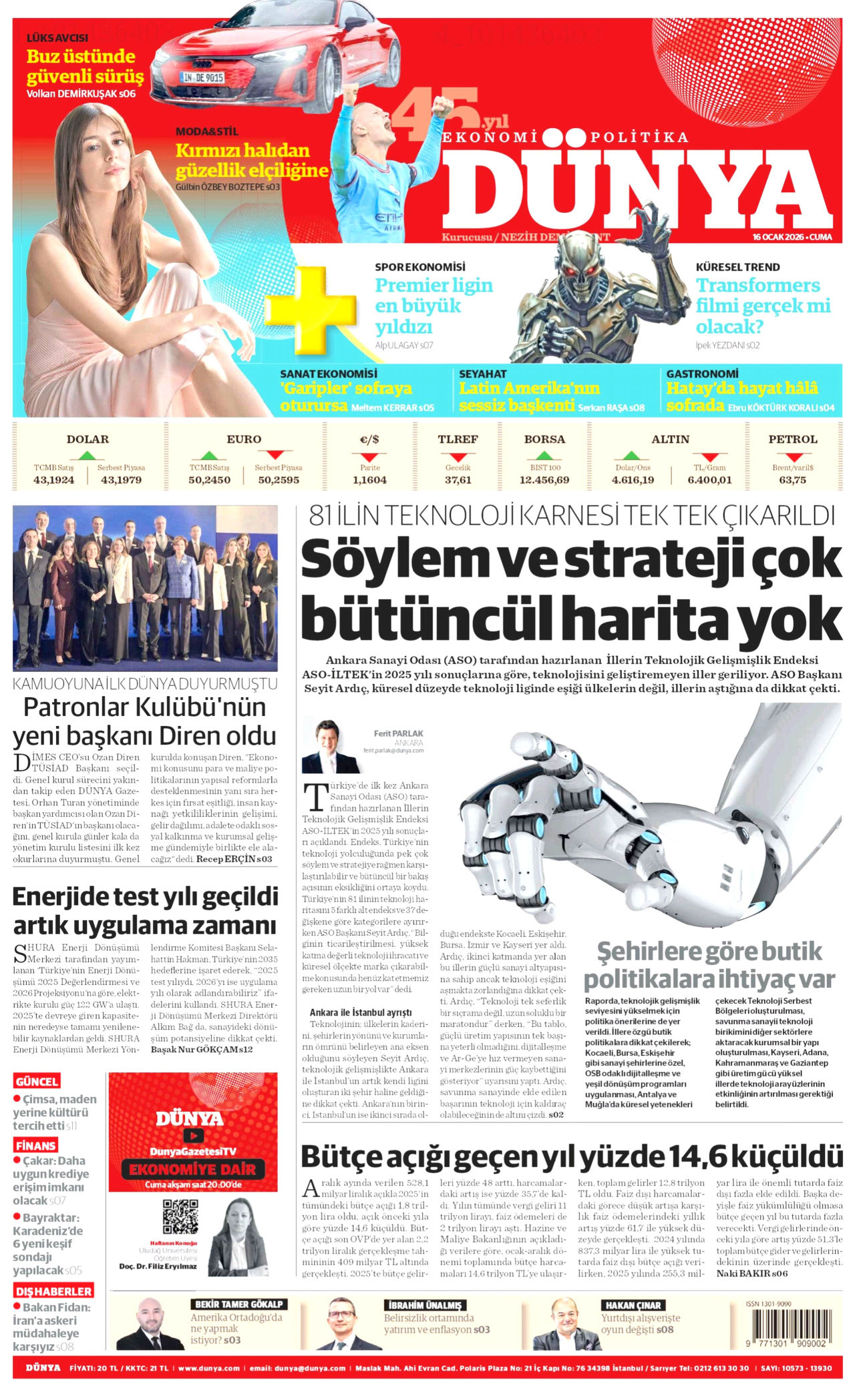 DÜNYA Gazetesi 16 Ocak 2026, Cuma Günü Manşeti