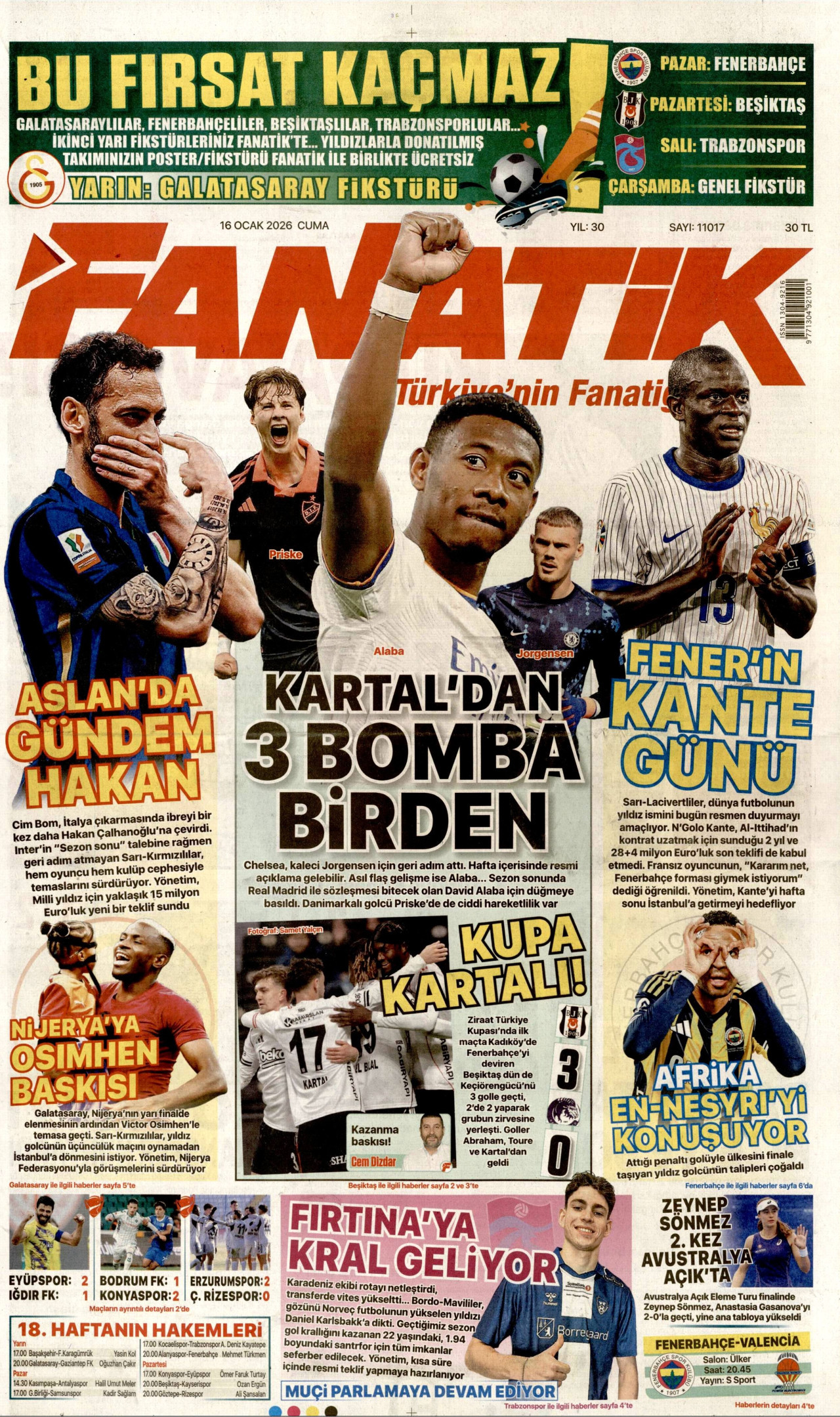 FANATİK Gazetesi 16 Ocak 2026, Cuma Günü Manşeti