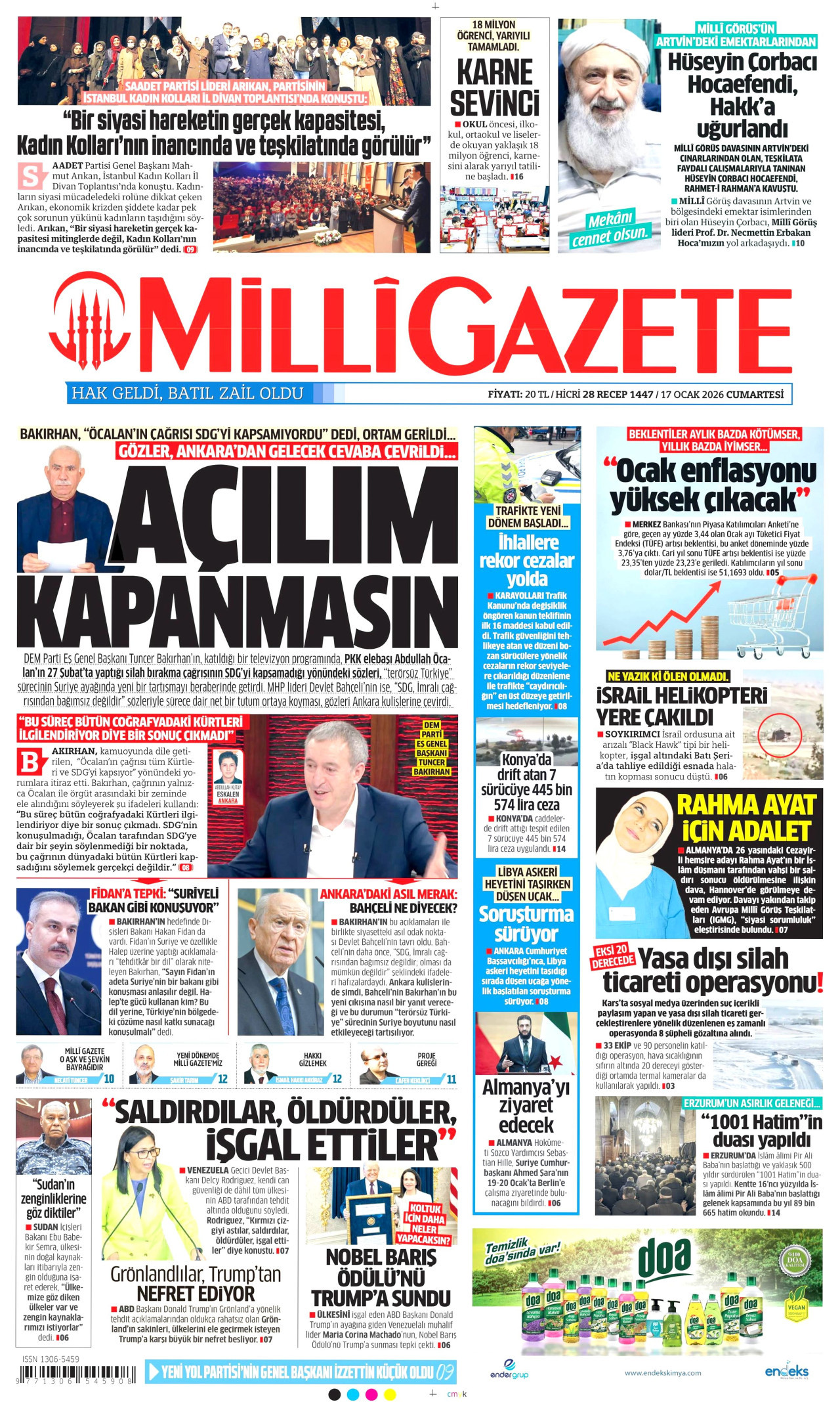 MİLLİ GAZETE Gazetesi 17 Ocak 2026, Cumartesi Günü Manşeti