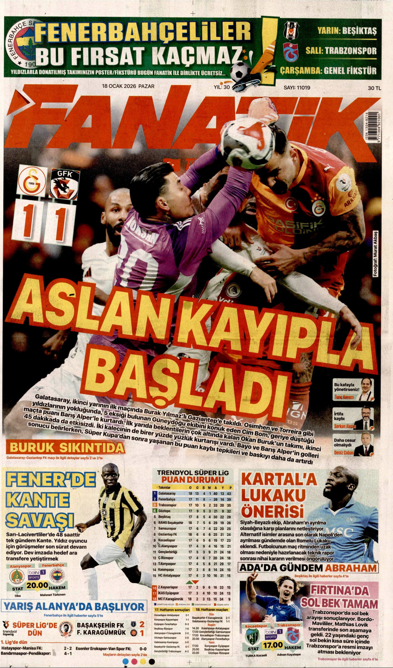 FANATİK Gazetesi 18 Ocak 2026, Pazar Günü Manşeti