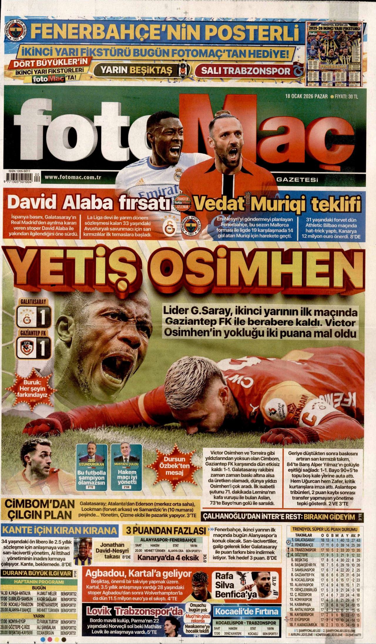 FOTOMAÇ Gazetesi 18 Ocak 2026, Pazar Günü Manşeti
