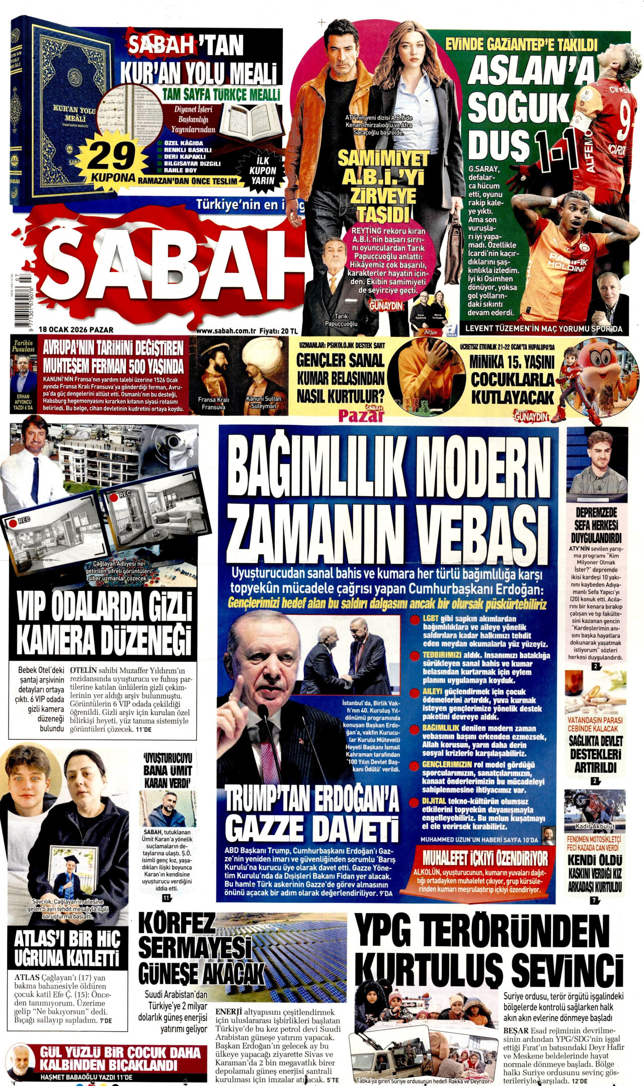 SABAH Gazetesi 18 Ocak 2026, Pazar Günü Manşeti