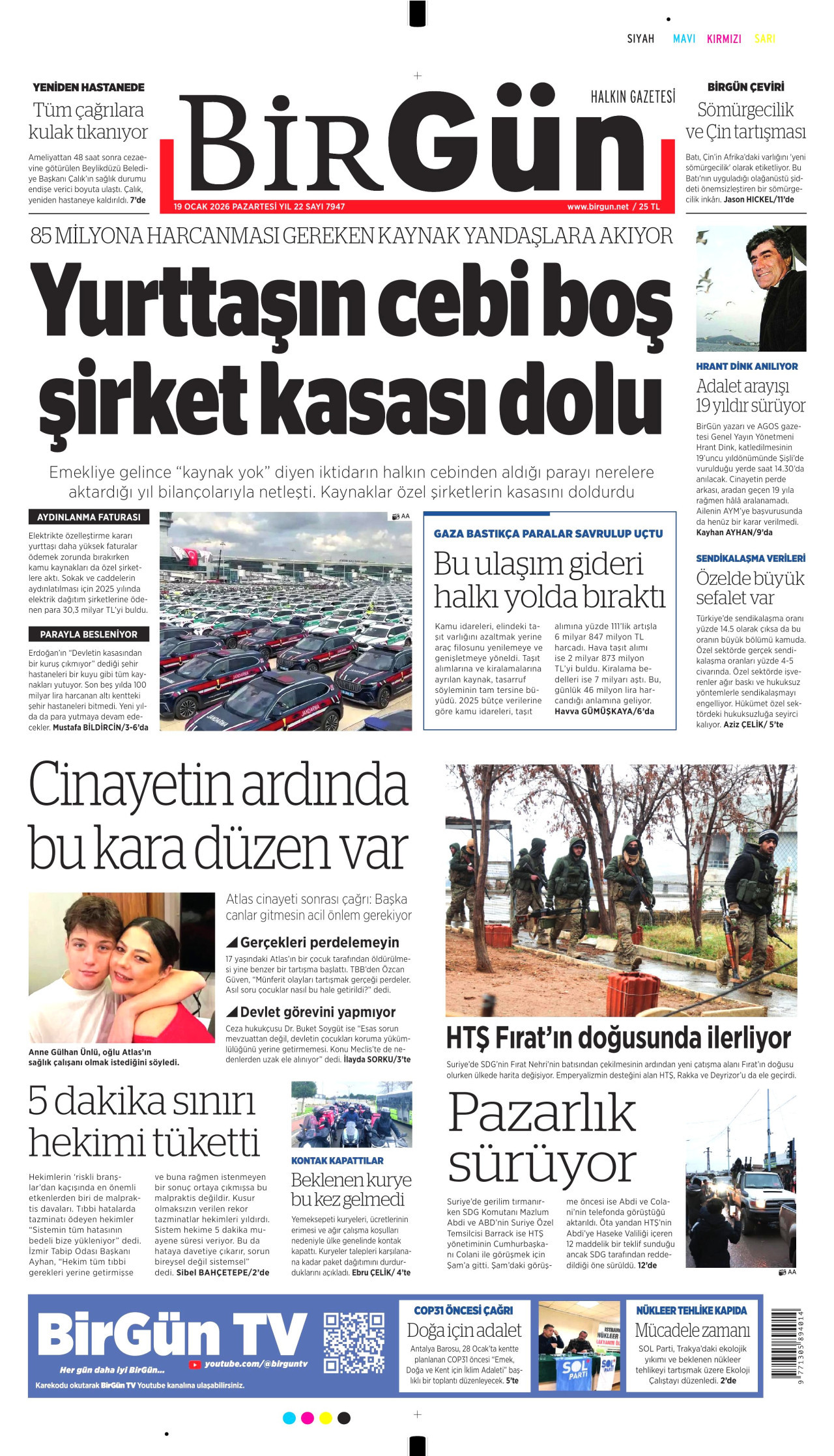 BİRGÜN Gazetesi 19 Ocak 2026, Pazartesi Günü Manşeti