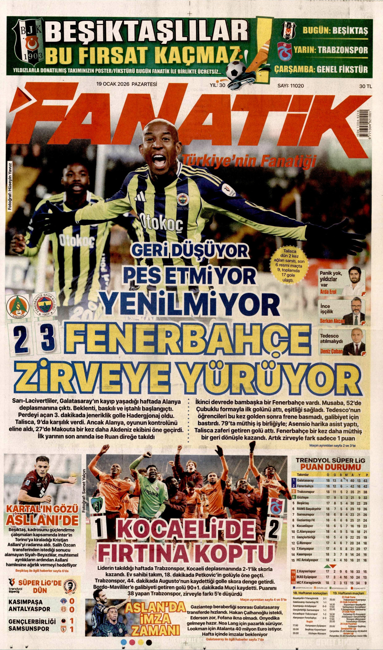 FANATİK Gazetesi 19 Ocak 2026, Pazartesi Günü Manşeti