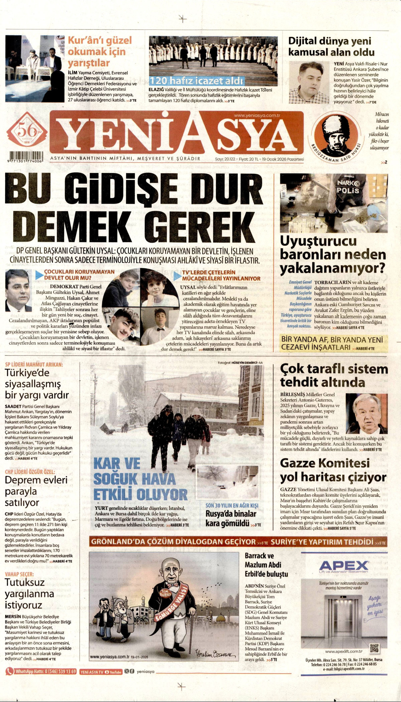 YENİ ASYA Gazetesi 19 Ocak 2026, Pazartesi Günü Manşeti