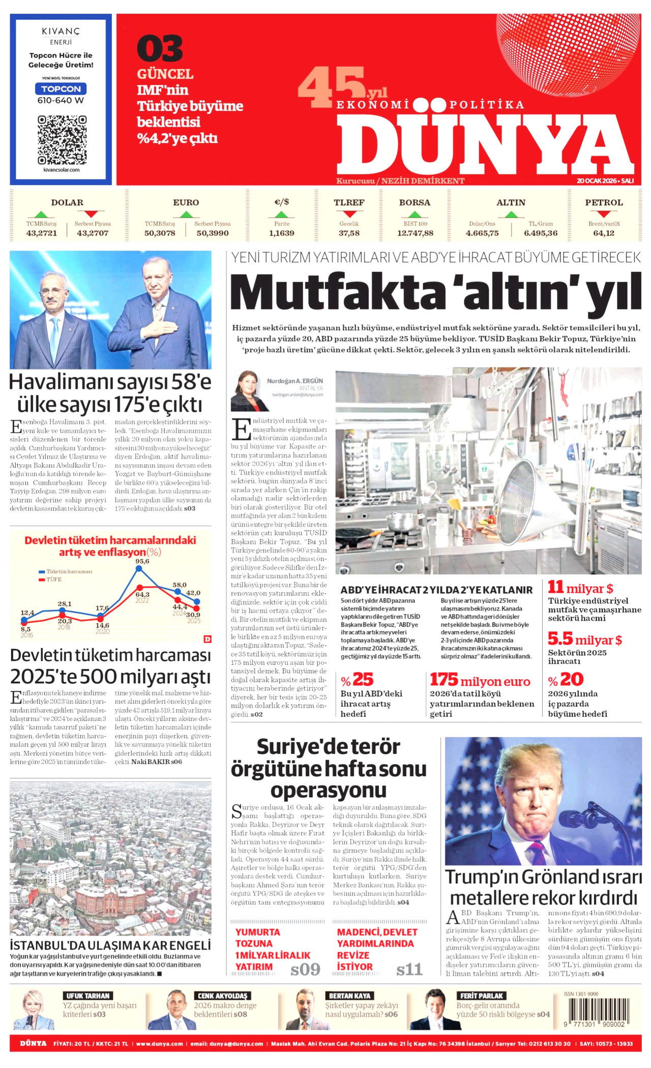 DÜNYA Gazetesi 20 Ocak 2026, Salı Günü Manşeti