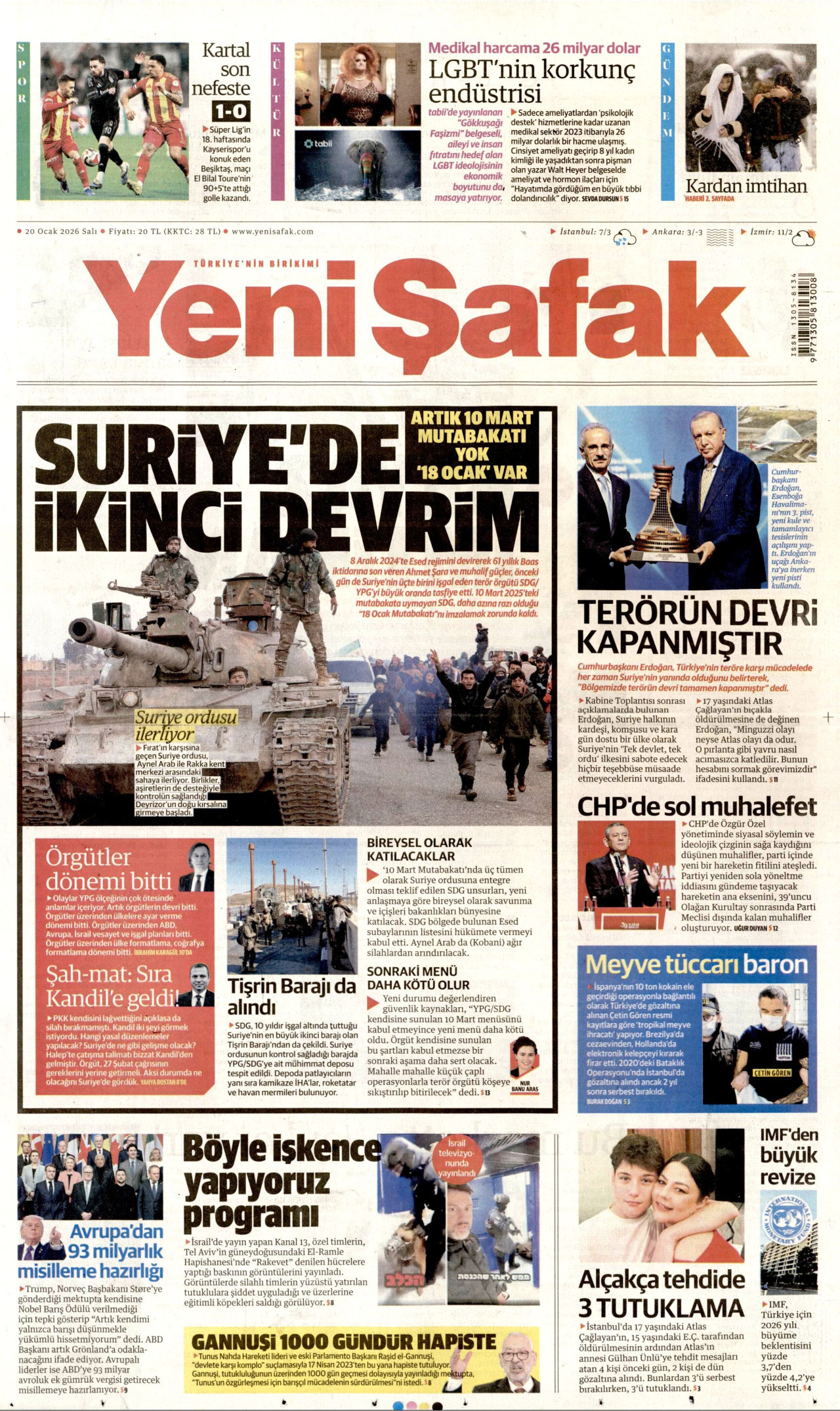 YENİ ŞAFAK Gazetesi 20 Ocak 2026, Salı Günü Manşeti