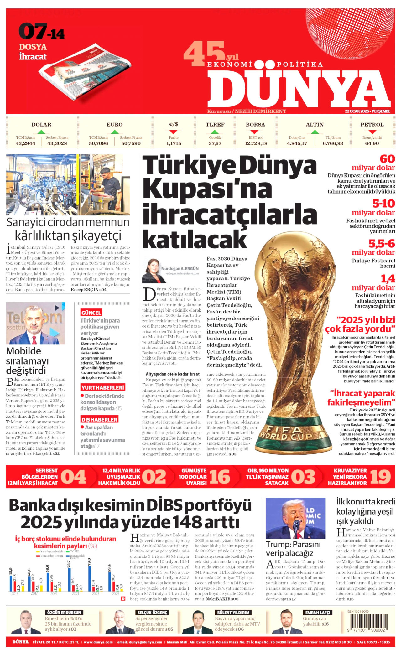 DÜNYA Gazetesi 22 Ocak 2026, Perşembe Günü Manşeti