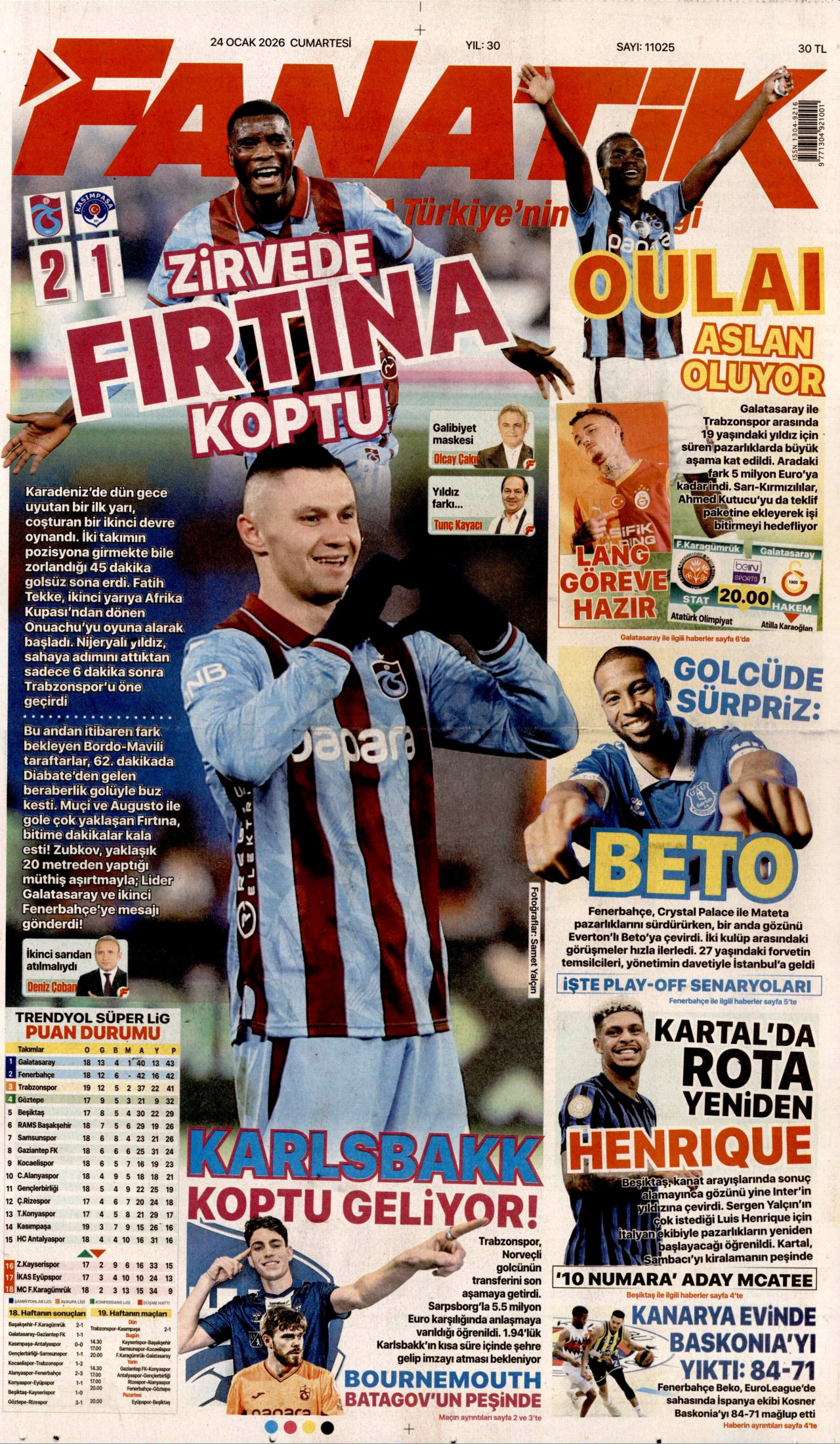 FANATİK Gazetesi 24 Ocak 2026, Cumartesi Günü Manşeti
